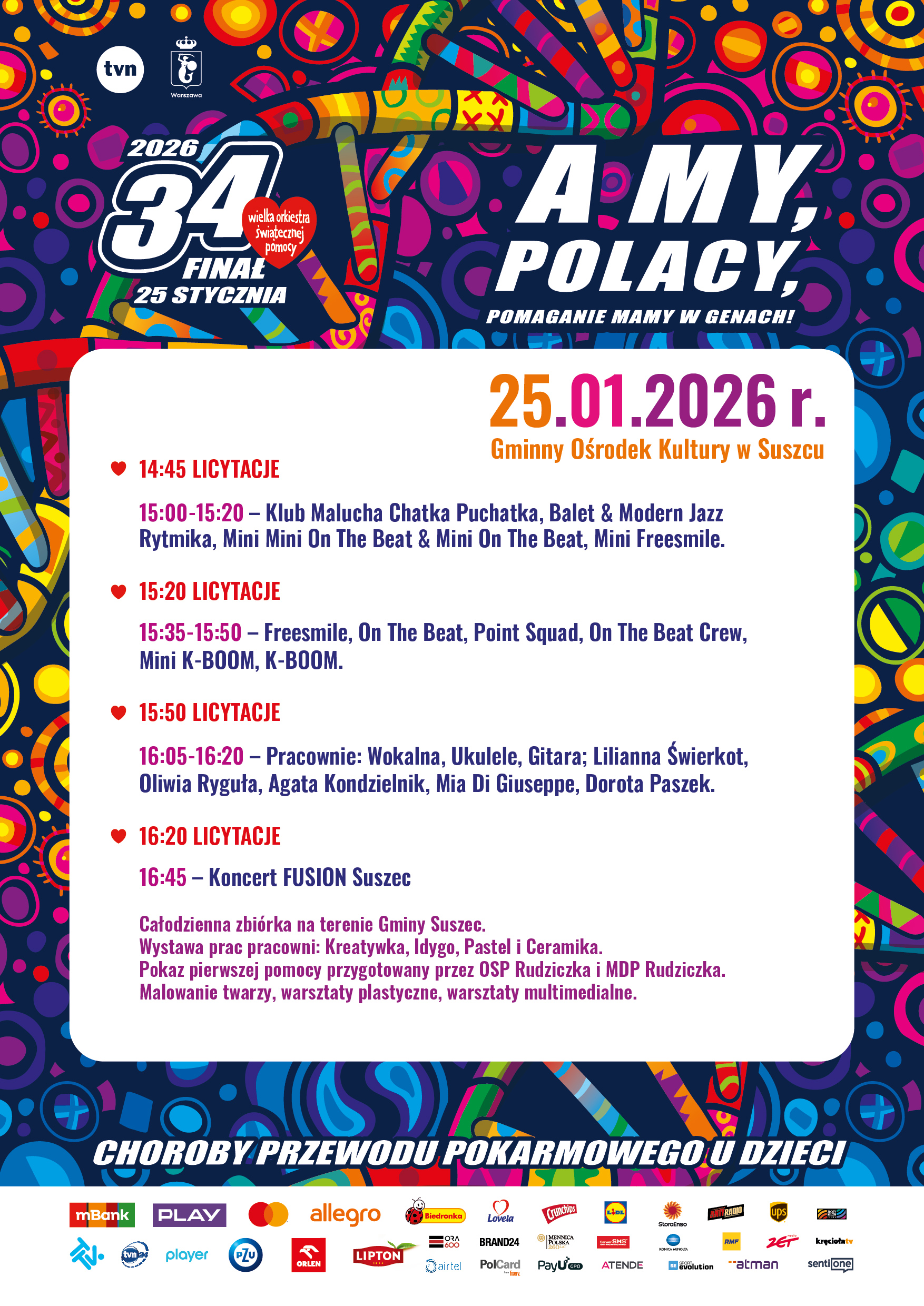 25 stycznia cała Polska zagra dla Wielkiej Orkiestry Świątecznej Pomocy, zagramy i my! Sztab w Suszcu zaprasza na 34. Finał WOŚP!