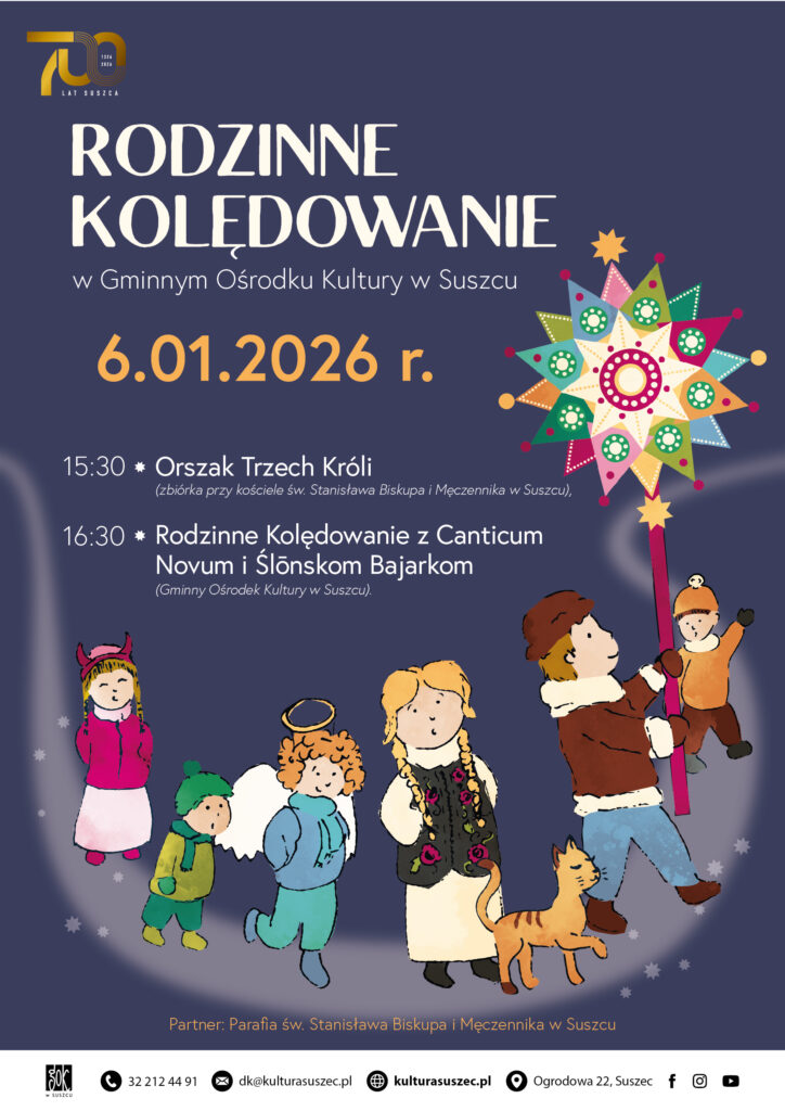 Zapraszamy do udziału w Rodzinnym Kolędowaniu! Razem z Canticum Novum i Ślonskom Bajarkom oraz parafią pw. Św. Stanisława Biskupa i Męczennika w Suszcu zapraszamy Was do udziału w  drugim Rodzinnym Kolędowaniu, którego celem jest nawiązanie do tradycji wspólnego śpiewanie kolęd i pastorałek. Wydarzenie rozpocznie się Orszakiem Trzech Króli, spod suszeckiego kościoła. Kolorowy orszak kolędniczy przejdzie ulicami Suszca (ul. Św. Jana,  ul.…