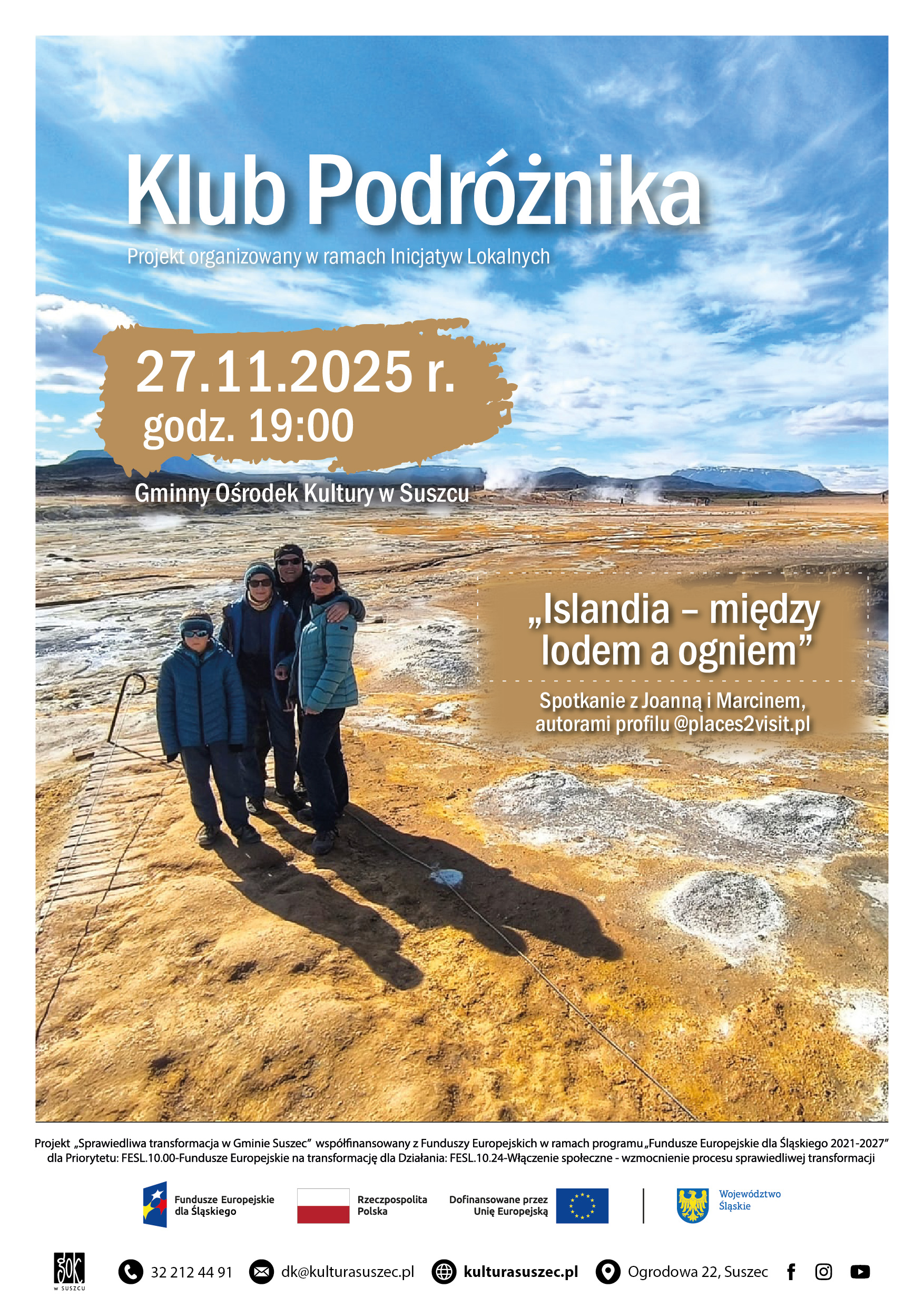 Na spotkanie zapraszamy 27 listopada 2025 r., o godz. 19.00 do Gminnego Ośrodku Kultury w Suszcu. Obowiązuje wstęp wolny.