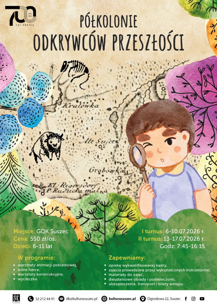 Obchodzone w tym roku 700-lecie Suszca to wyjątkowy jubileusz. Zapraszamy na półkolonie, podczas których przeszłość, natura i wyobraźnia spotkają się w niezwykłej przygodzie! To tydzień pełen inspirujących historii, twórczych działań i dobrej zabawy, podczas którego każdy uczestnik odkryje w sobie małego miłośnika Suszca. Czekają na Was zajęcia, które pobudzą kreatywność i pozwolą spojrzeć na Wasze najbliższe otoczenie z nowej perspektywy.…