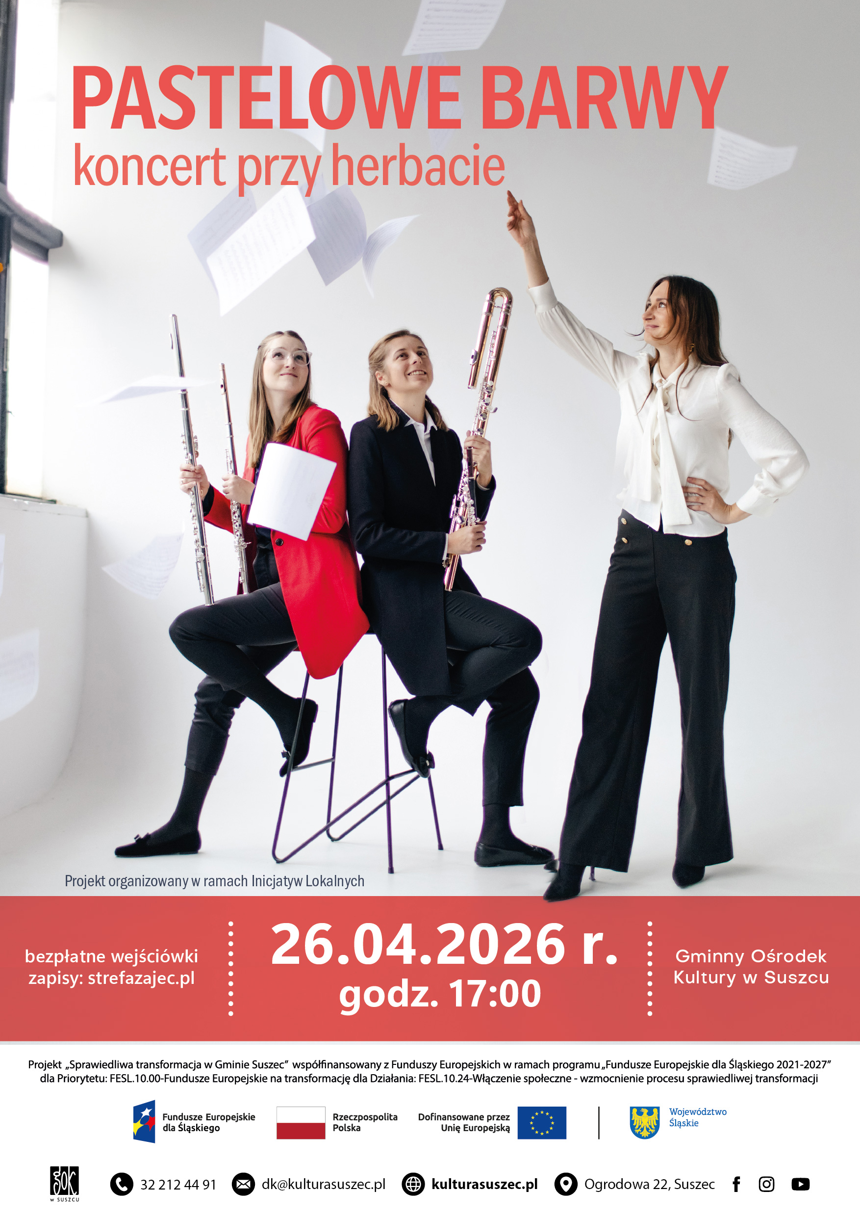 A już 26 kwietnia 2026r. o 17.00 zapraszamy na kameralny koncert przy herbacie w wykonaniu zespołu FLUO. W programie znajdzie się muzyka impresjonistyczna oraz utwory sprzyjające wyciszeniu i odpoczynkowi (m.in. Debussy, Clarke, Delibes). Przyjazna atmosfera i możliwość napicia się herbaty pozwolą w pełni zanurzyć się w dźwiękach i na chwilę oderwać od codzienności.