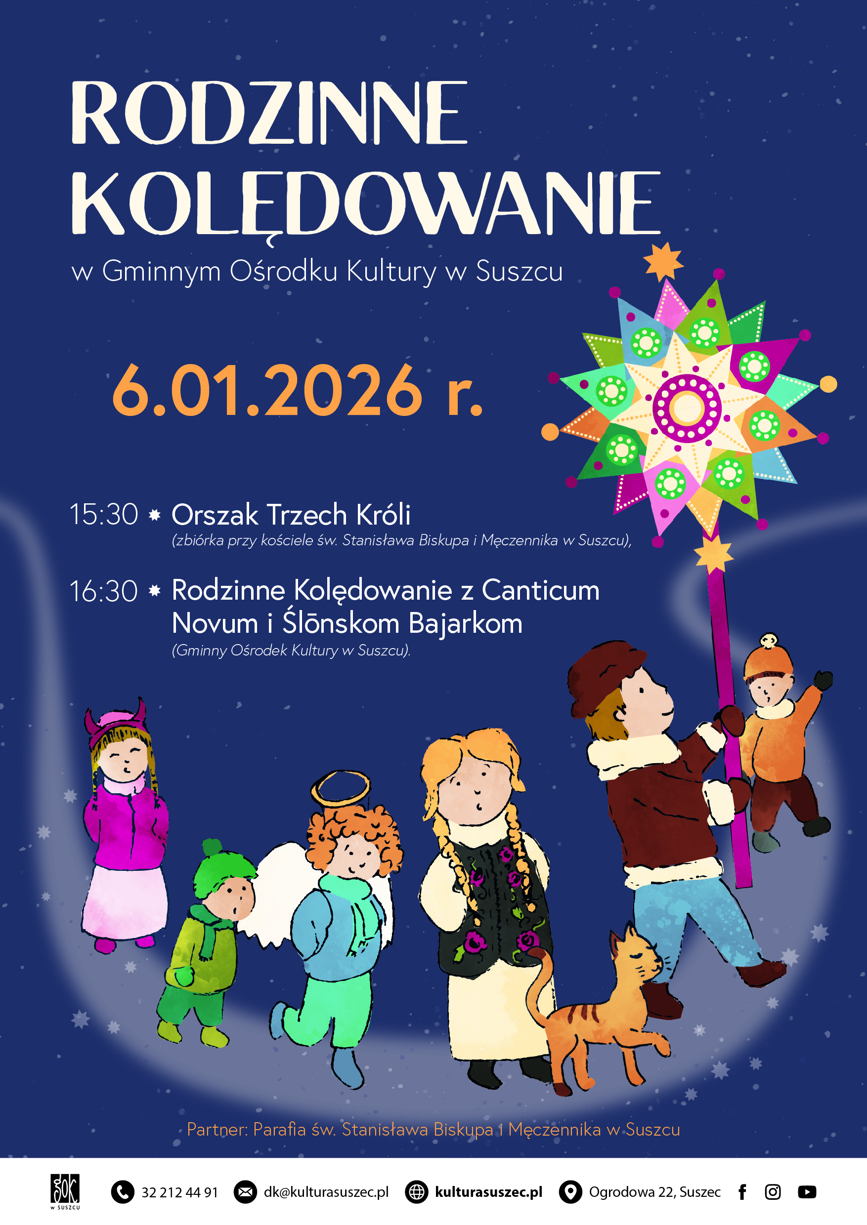 Razem z Canticum Novum i Ślonskom Bajarkom oraz parafią pw. Św. Stanisława Biskupa i Męczennika w Suszcu zapraszamy Was do udziału w drugim Rodzinnym Kolędowaniu, którego celem jest nawiązanie do tradycji wspólnego śpiewanie kolęd i pastorałek.