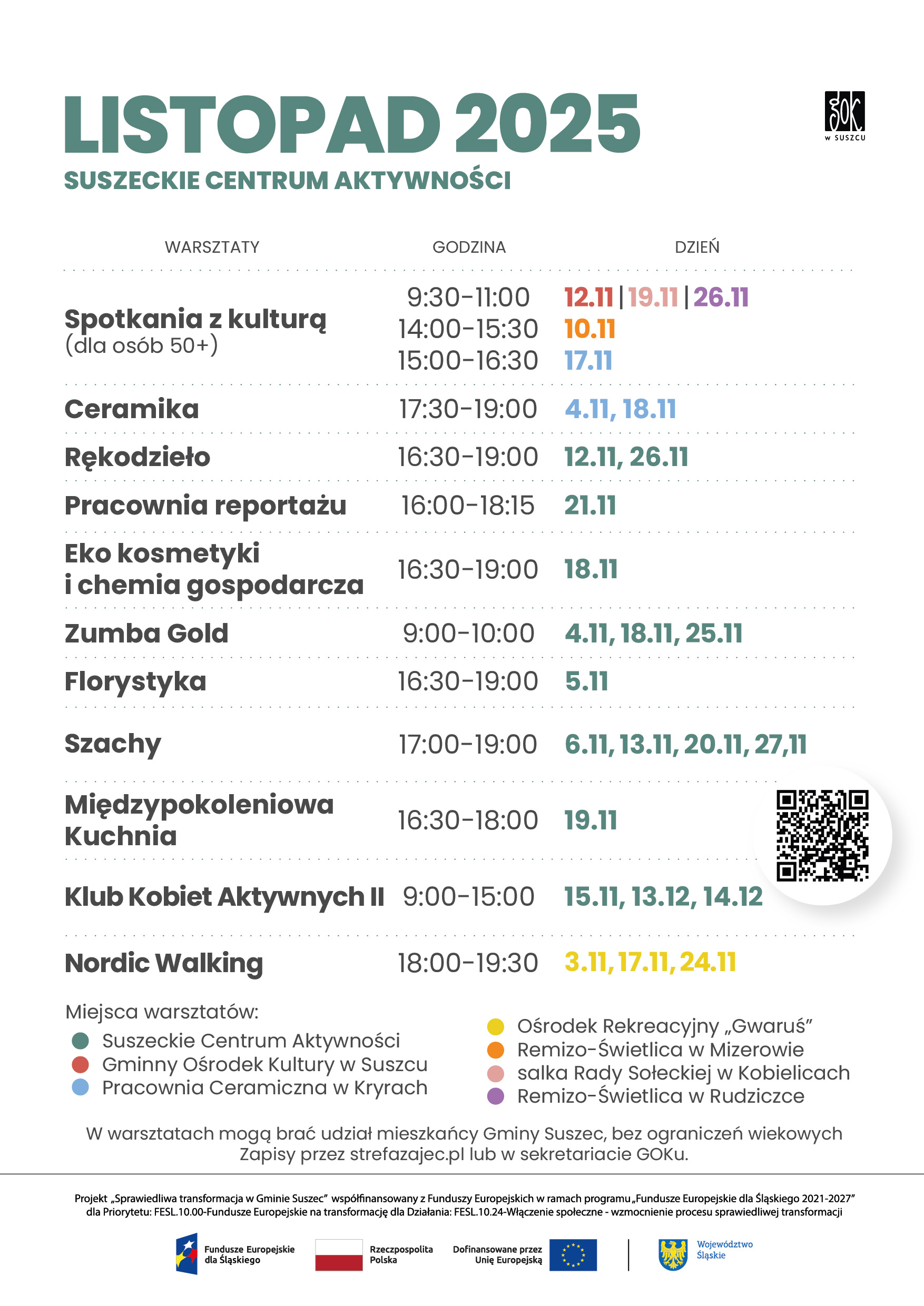 - zajęcia odbywają się w Suszeckim Centrum Aktywności (budynek Klubu Seniora, ul. Wyzwolenia 2, Suszec)