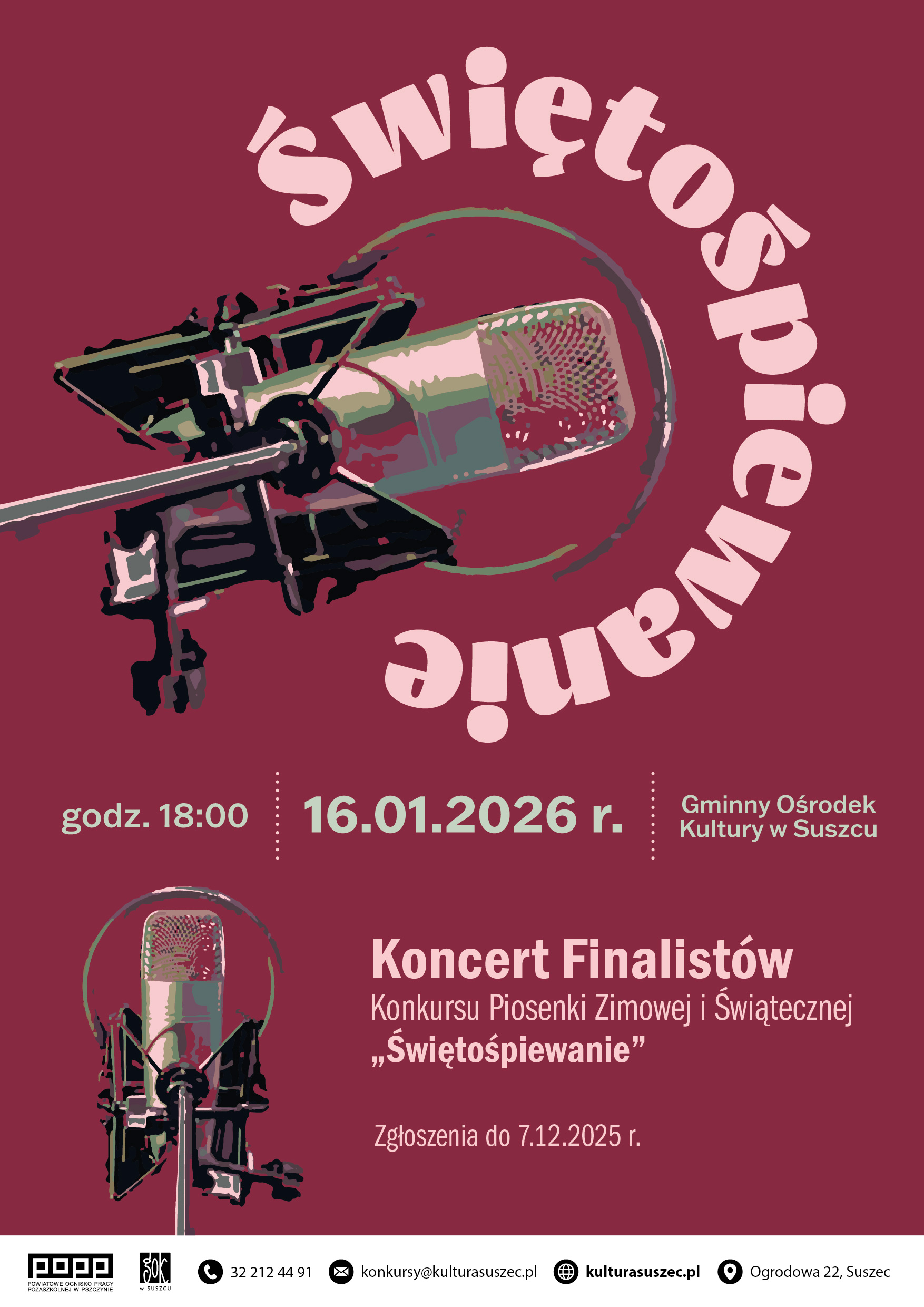Kontakt: Gminny Ośrodek Kultury w Suszcu, ul. Ogrodowa 22, 43-267 Suszec, tel.: 32 212 44 91 wew. 19, e-mail: konkursy@kulturasuszec.pl. Sekretariat GOK czynny od poniedziałku do czwartku w godz. 8:00-20:00 oraz w piątki w godz. 8:00-19:00.