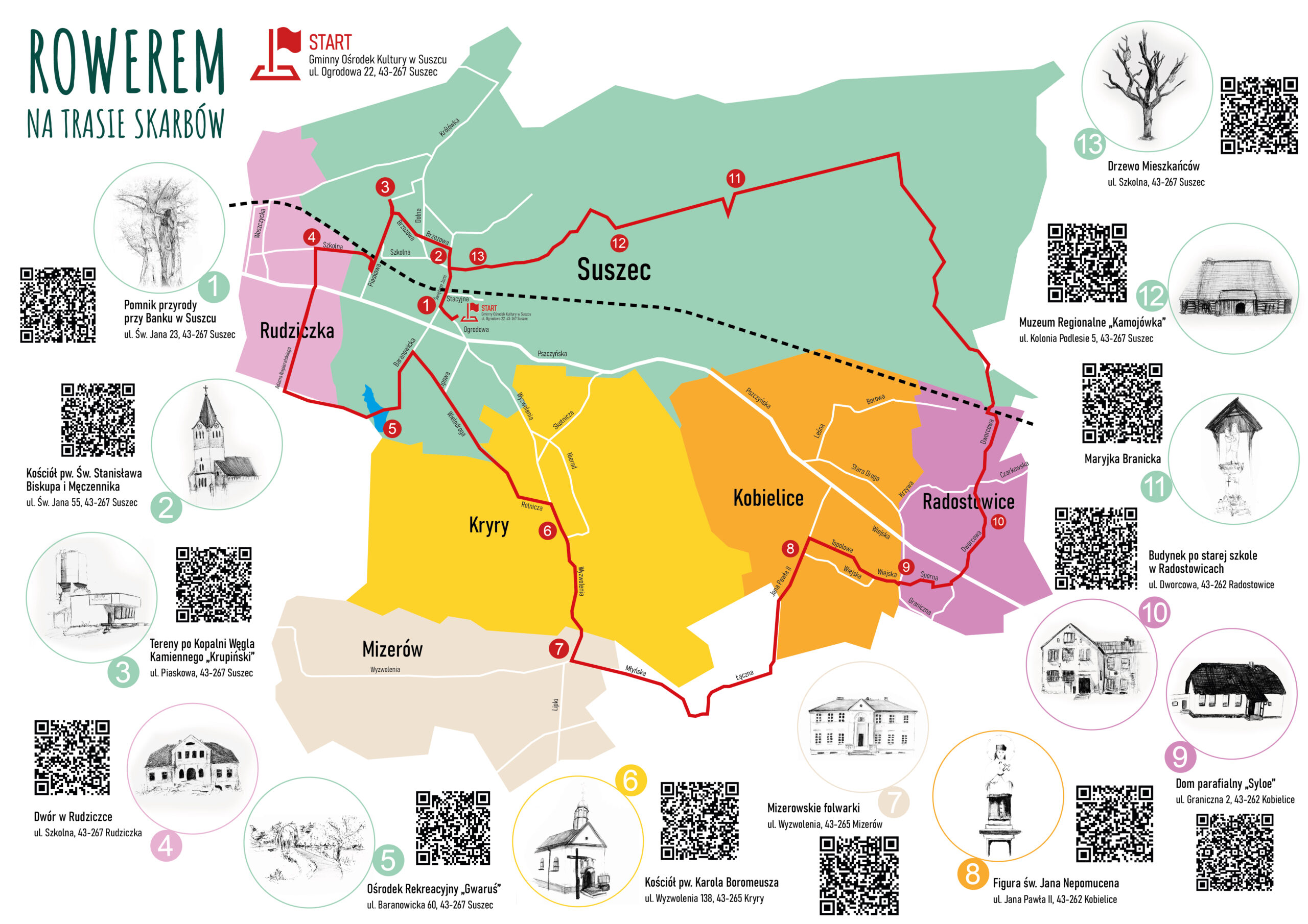 Powstały dwa warianty trasy: trasa krótsza – ok. 15 km oraz trasa dłuższa – ok. 45 km. Dzięki mapie z kodami QR, rowerzyści mogą odtworzyć materiały z informacjami o danym miejscu. Jest także dostępna wersja do odsłuchu. Na otwarcie projektu został zorganizowany rajd rowerowy, w którym wzięli udział uczniowie klas 8 ze Szkoły Podstawowej im. Janusza Korczaka w Suszcu. Mieli okazję przejechać krótszy wariant trasy i posłuchać ciekawostek opowiedzianych przez przewodnika, a także zobaczyć jak korzystać z powstałych map.