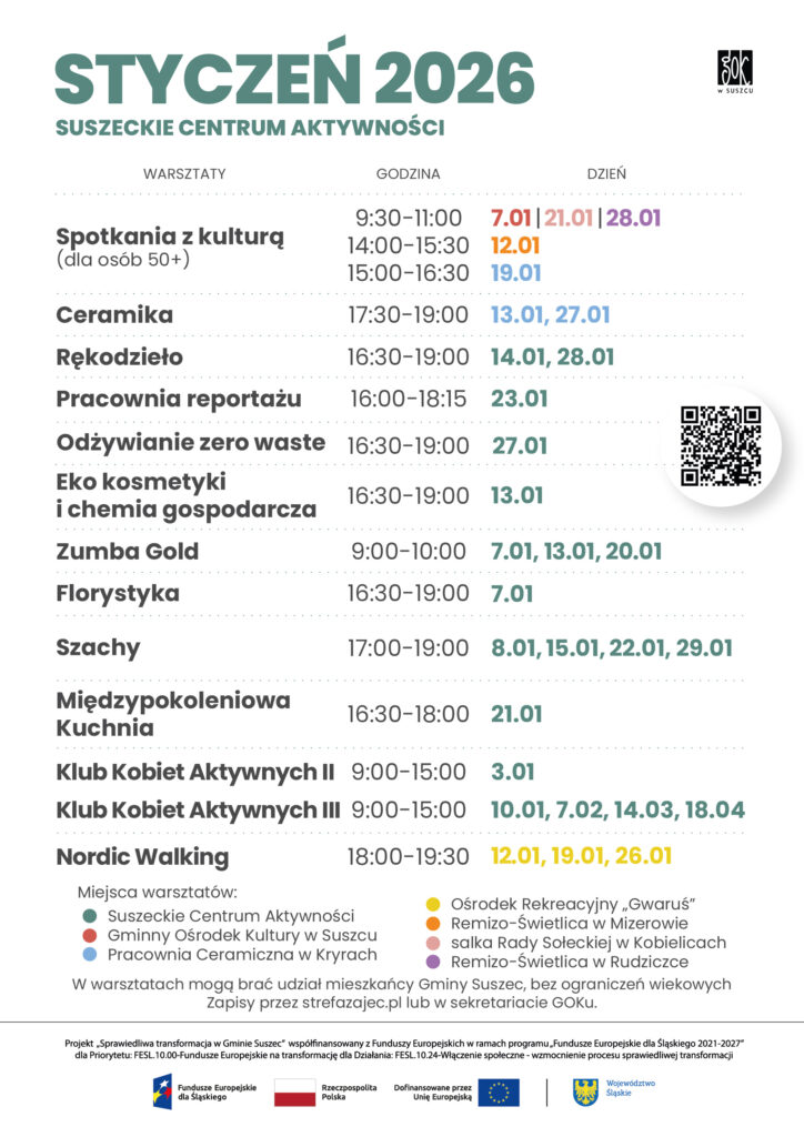 Przed nami kolejny miesiąc działania Suszeckiego Centrum Aktywności. Przypominamy, że wszystkie warsztaty są bezpłatne i skierowane do osób mieszkających, pracujących lub uczących się w Gminie Suszec. OFERTA WARSZTATÓW: 1. SPOTKANIA Z KULTURĄ - dla osób 50+ Spotkania z kulturą to spotkania z pokazem zdjęć i filmików o kulturze i sztuce, prowadzone przez Monikę Michalik. Zajęcia odbywają się w każdym sołectwie…