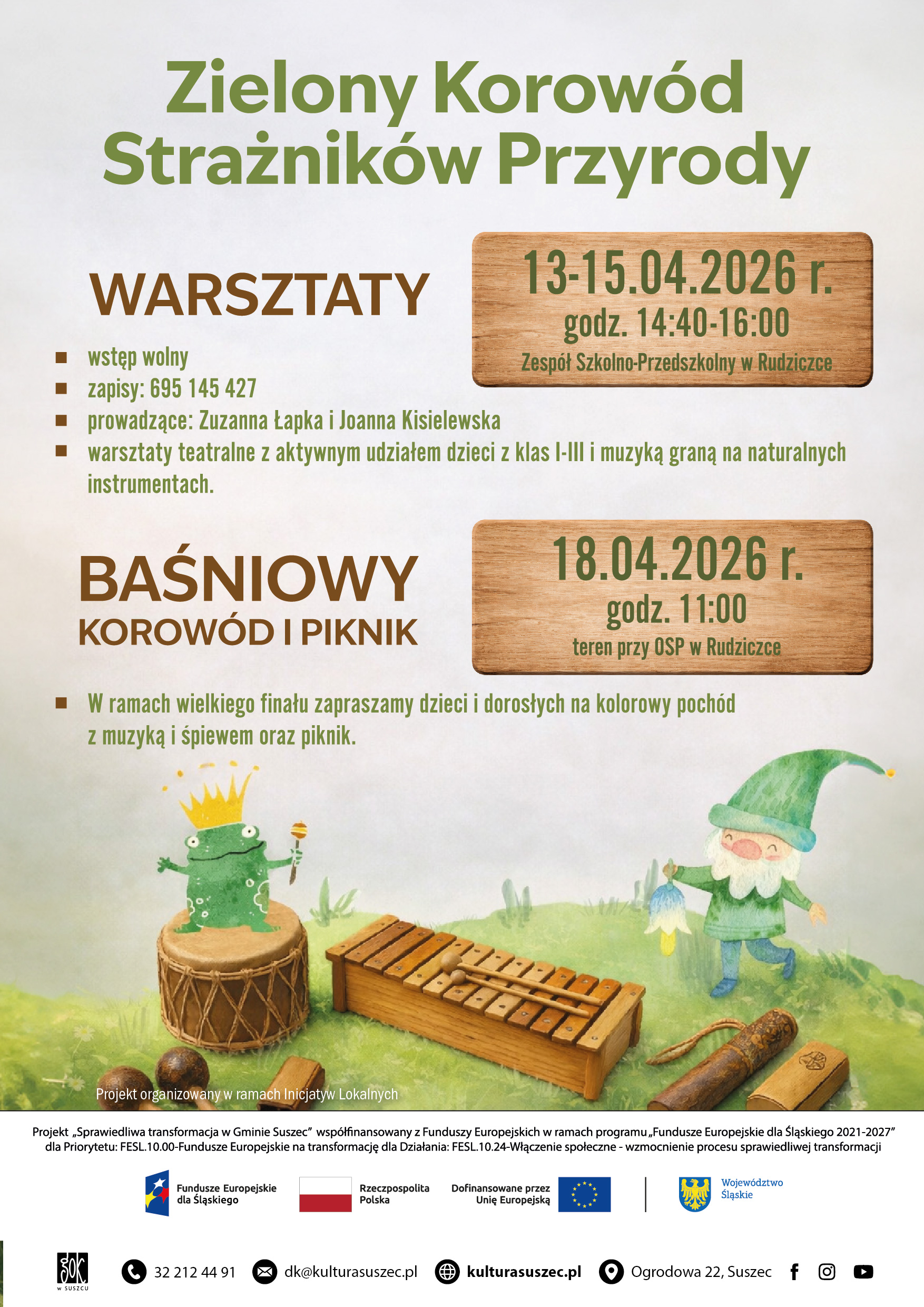 Inicjatywa kierowana jest do dzieci uczęszczających do klas I-III w Gminie Suszec. W ramach działań zapraszamy do udziału w trzech baśniowych wydarzeniach teatralnych. Każde spotkanie będzie aktywnie angażowało uczestników w spektakl z muzyką na żywo, z podkreśleniem wagi dbania o środowisko i ekologię. Całość podsumuje wydarzenie finałowe w formie kolorowego korowodu i pikniku rodzinnego.